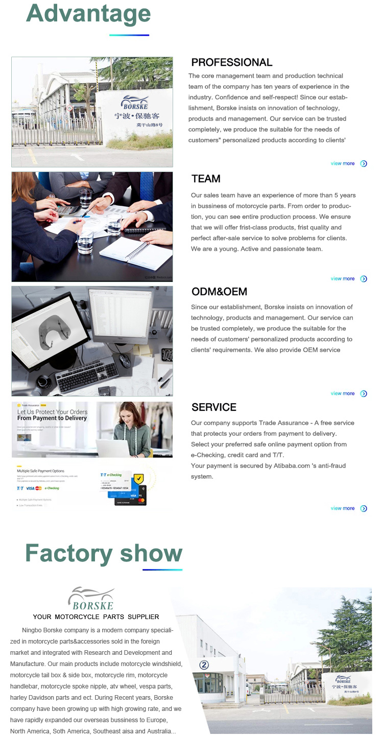 Ningbo Borske Vehicle Parts Co.,Ltd. ist ein modernes Unternehmen, das sich auf Motorradteile und -zubehör spezialisiert hat, die auf dem ausländischen Markt verkauft werden, und in dem Forschung und Entwicklung sowie Herstellung integriert sind.