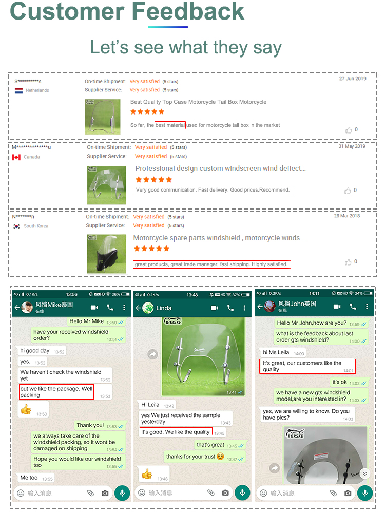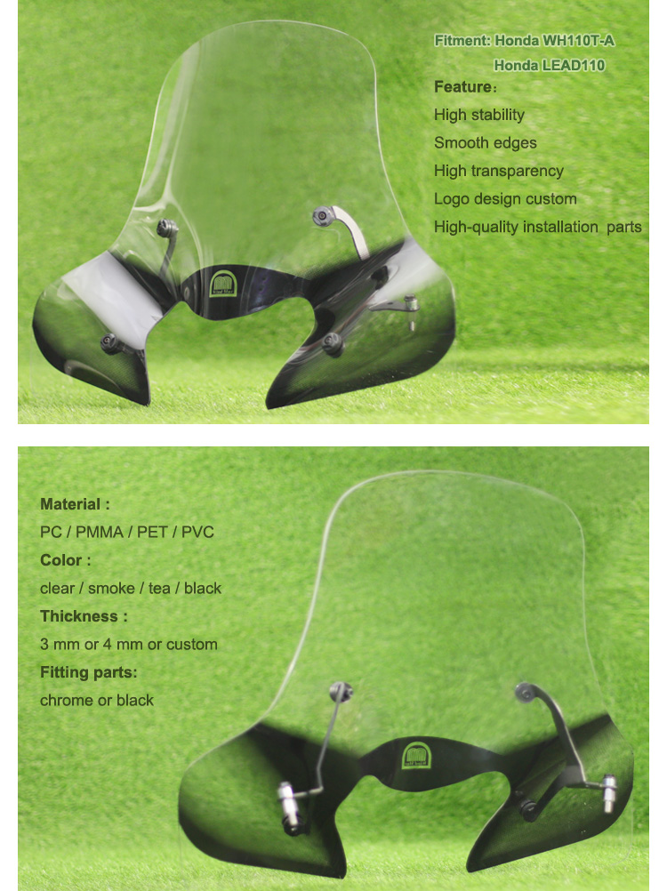 Material:PMMA / PC / PVC / PETMarca:BorskeNome do produto:Para-brisas para motociclosAjuste:para LEAD 110Cor:Claro / Fumo / Chá / PretoEspessura:3mm ou 4mm ou PersonalizadoMOQ:100 Conjuntos