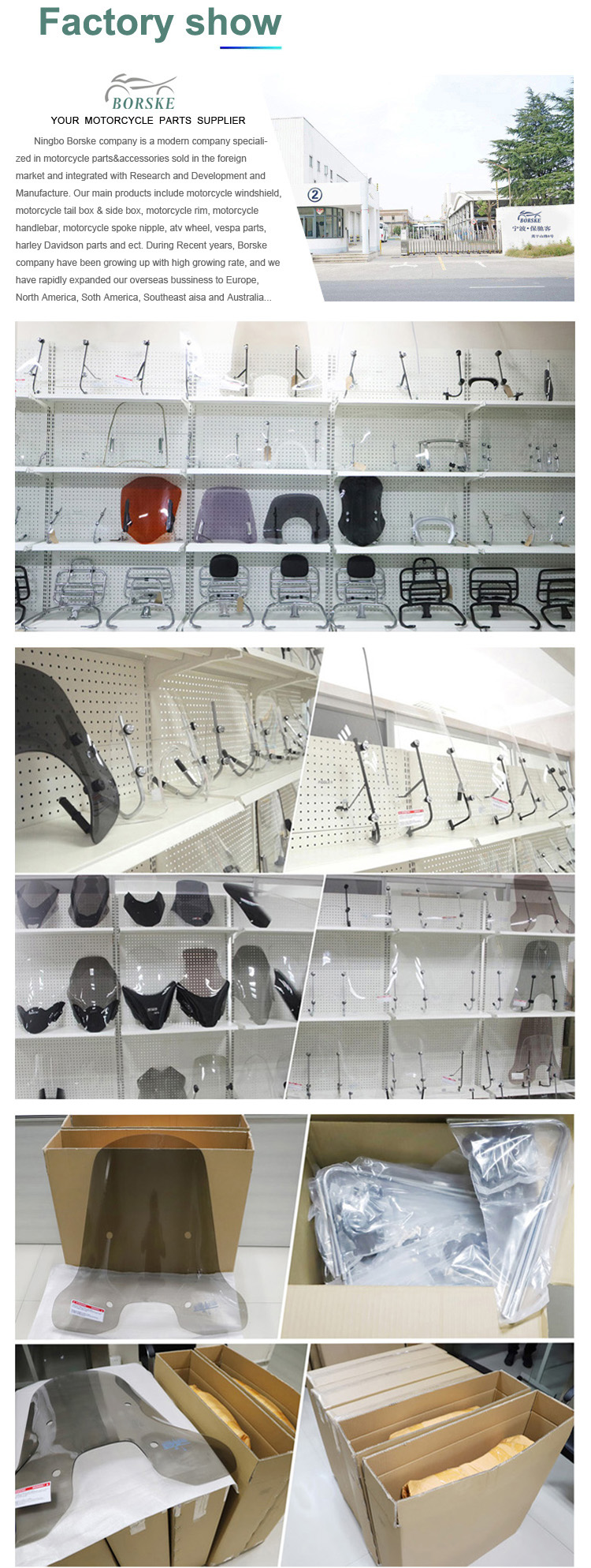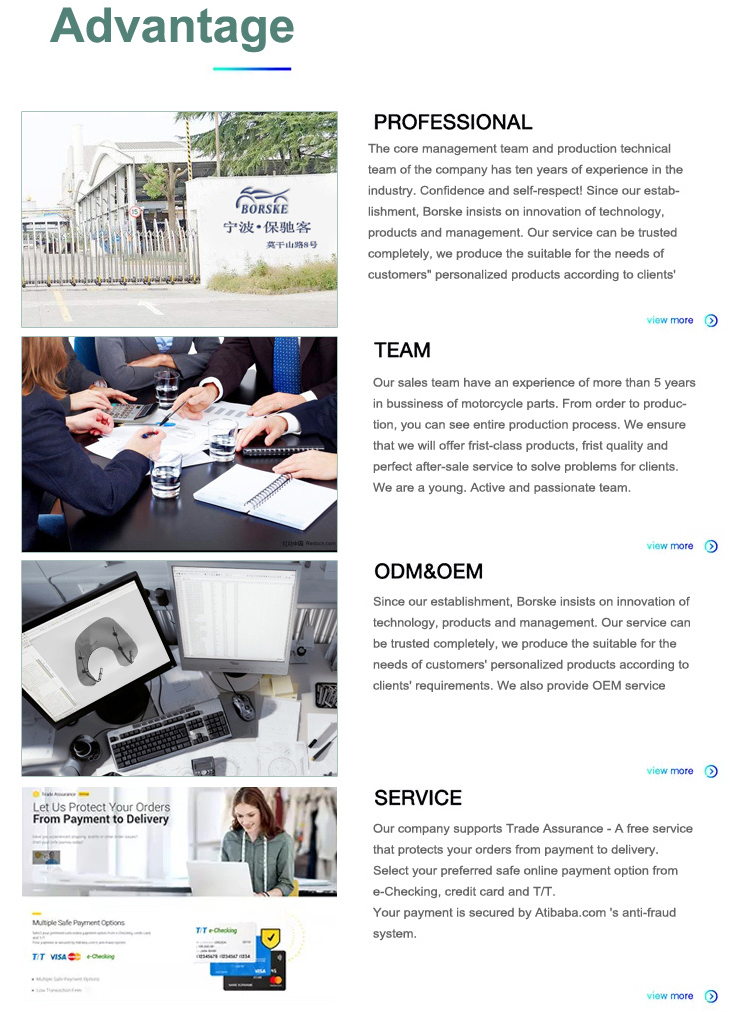 Ningbo Borske Vehicle Parts Co., Ltd. é uma empresa moderna especializada em peças e acessórios para motociclos vendidos no mercado externo e integrada com I&D e fabrico.