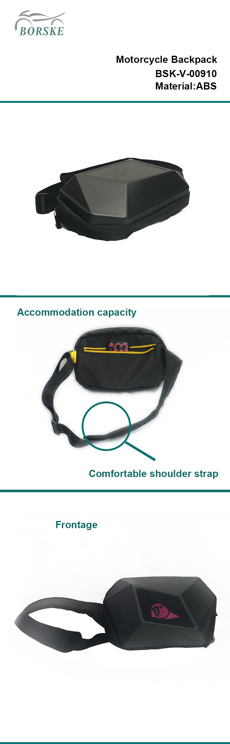 Material:ABSType:motorcycle helmet bagPlace of Origin:Zhejiang, ChinaBrand Name:BORSKEModel Number:BSK-00910Warranty:1 yearProduct name:LED Sling BagUsage:StorageColor:BlackMOQ:50pcsService:OEM ODM AcceptedOEM:AccpectedQuality:International Standard