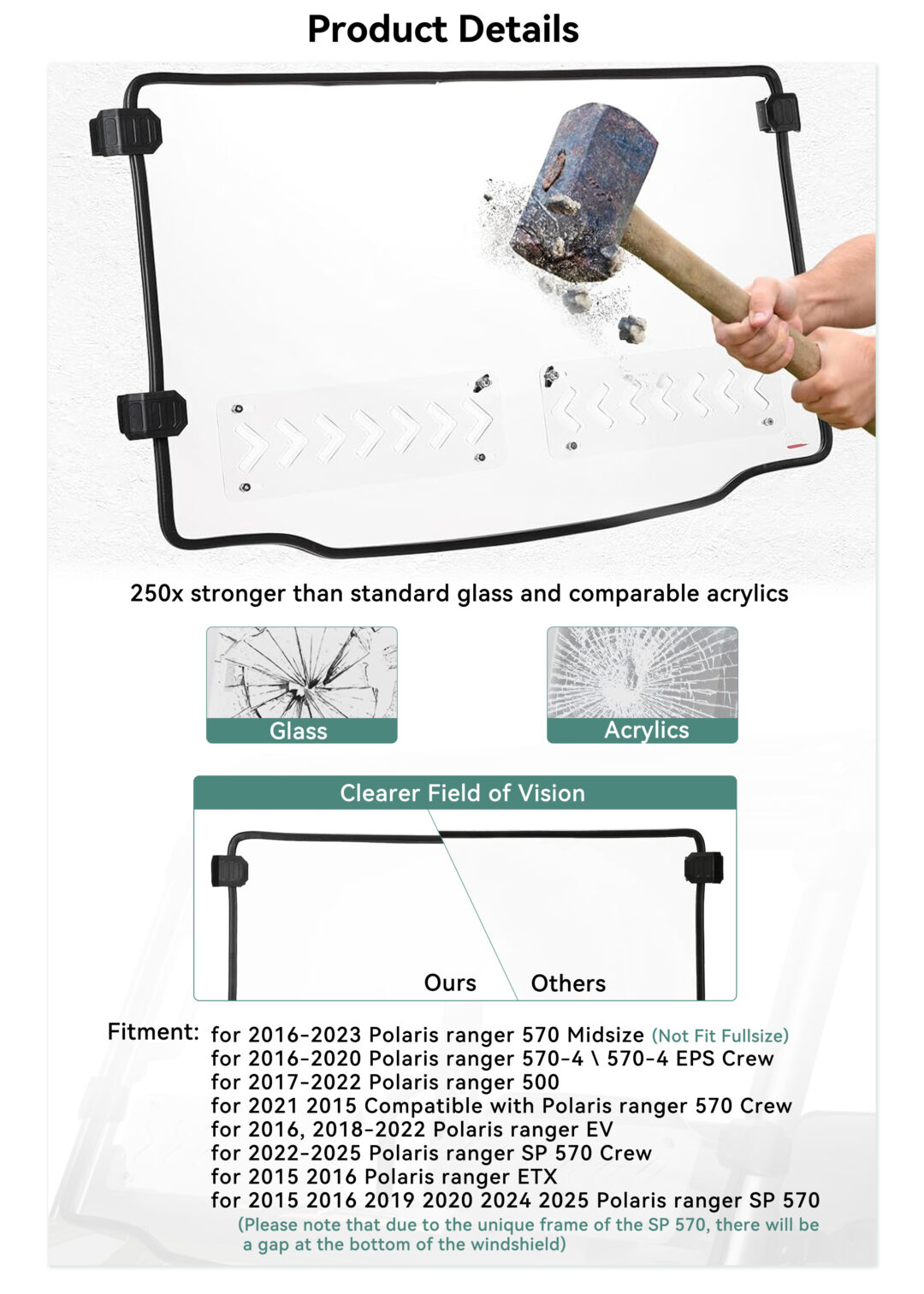 Borske Custom UTV Full Front Windshield Windshield for RANGER MIDSIZE 570 Full