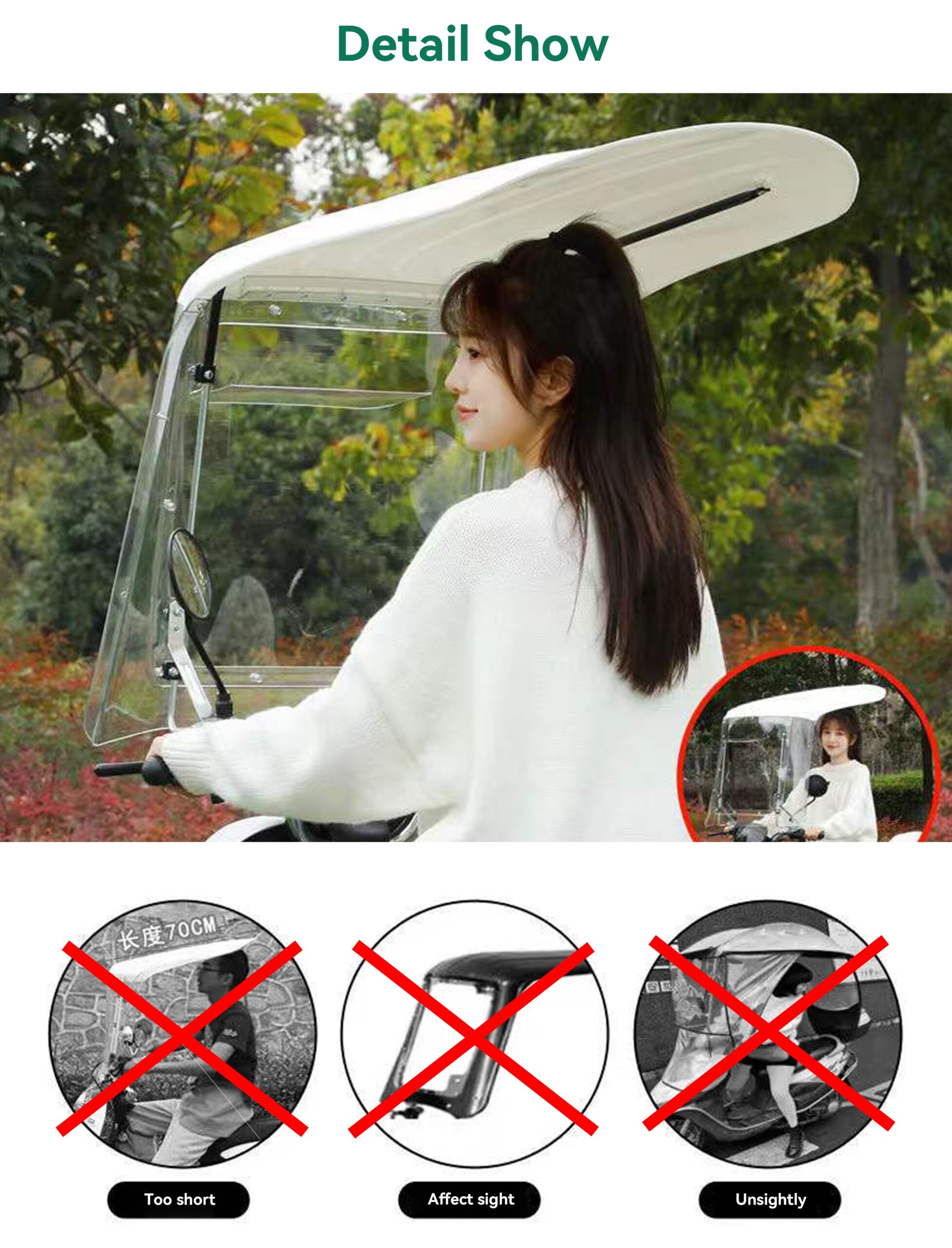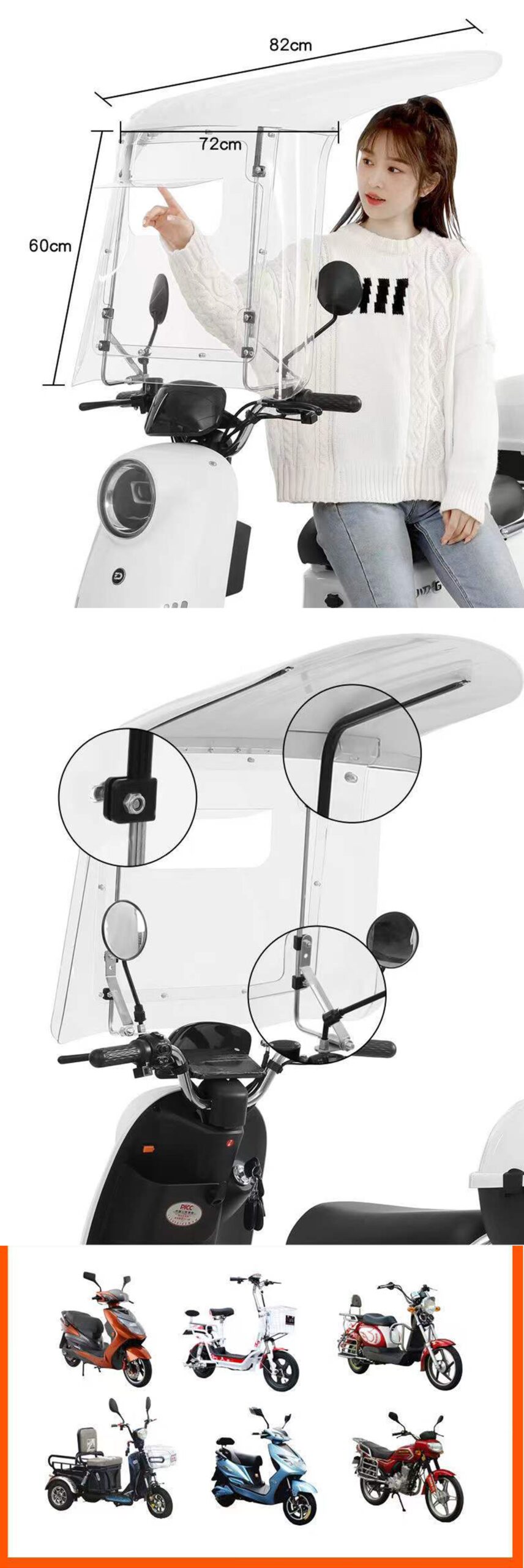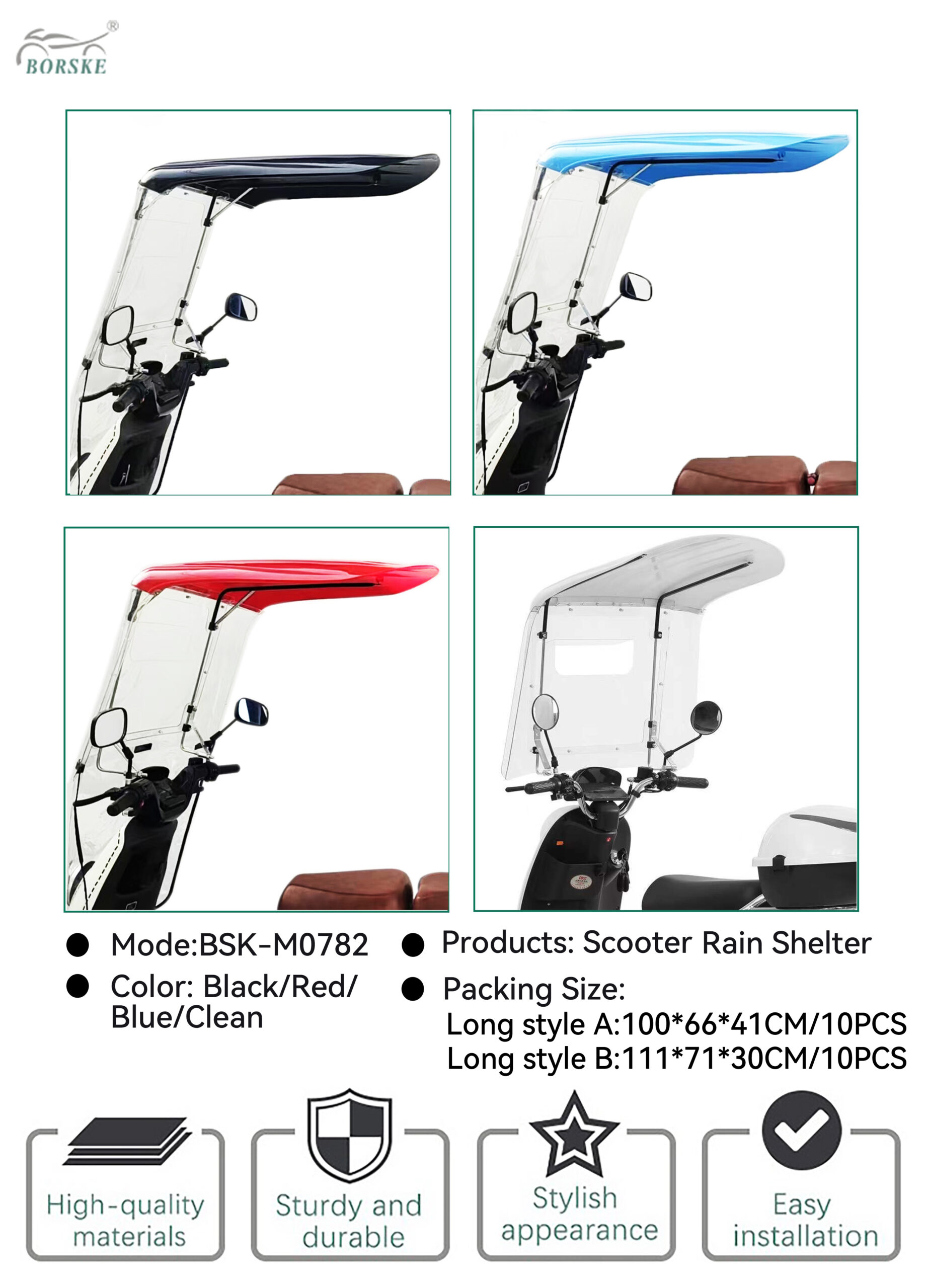The BSK-M0782 is a practical motorcycle rain umbrella that keeps you dry and protected. Made with a durable PMMA frame and cover, it’s your simple solution for comfortable commuting on scooters, e-bikes, and small motorcycles.